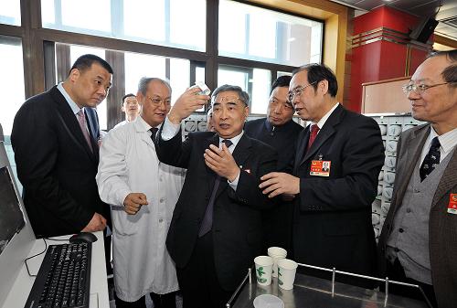 又是一年春草绿,依然十里杏花红。2011年3月9日,全国人大代表、著名中医内科专家、中国工程院——张伯礼院士,中国中医研究院原党委书记、全国政协委员——姚乃礼,国家中医药管理局台港澳交流合作中心主任王承德委员,天士力制药股份有限公司董事长闫希军,康美药业股份有限公司董事长马兴田在中国中医科学院广安门医院王阶院长、院长助理李益生、药剂科主任王丽霞、副主任杨响光等人的陪同下来到广安门医院参观我公司为医院配备的现代智能中药房。